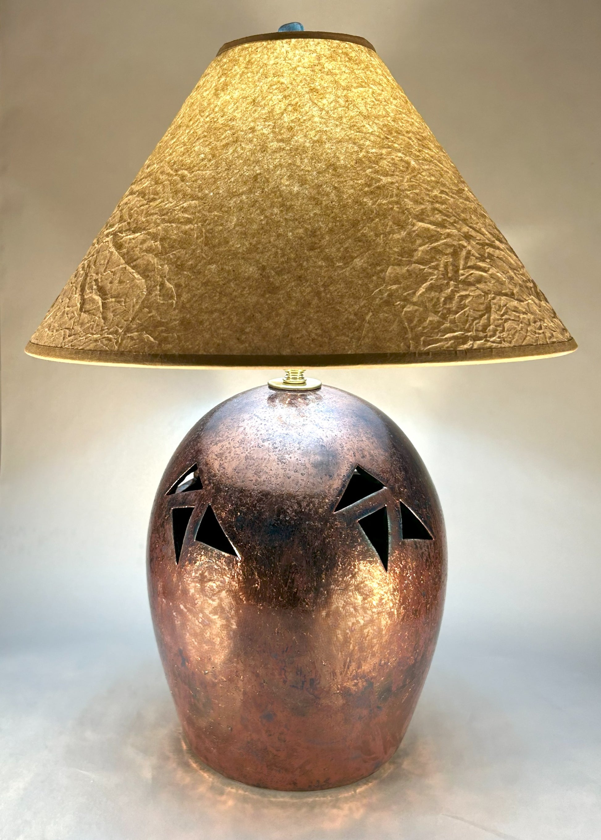 Elevate your ambiance with our exquisite Raku table lamp, a fusion of artistry and functionality. The base features a stunning copper blue glaze, showcasing the unique and unpredictable patterns synonymous with Raku firing. Topped with a delicately crafted wrinkled paper shade, this lamp exudes a warm, diffused glow. The finishing touch lies in the handmade finial, adding an extra layer of artisanal charm to illuminate your space with both style and character.