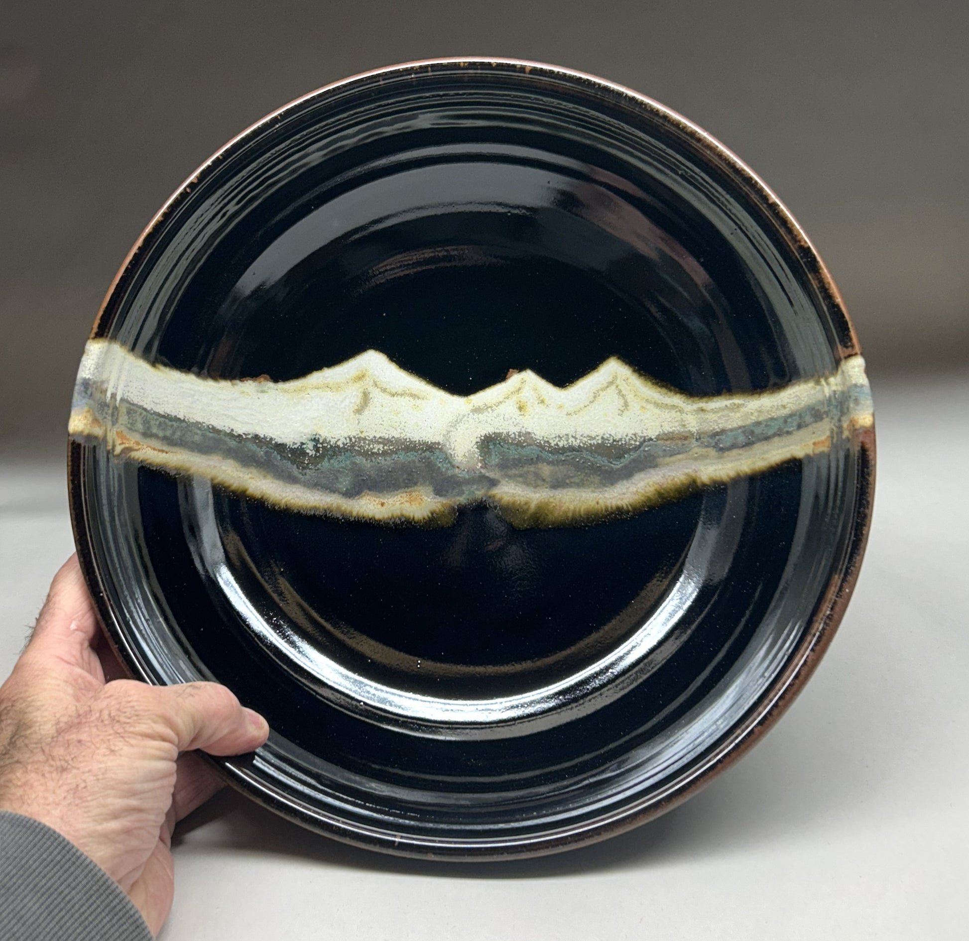 Elevate your dining experience with this handmade pottery serving bowl featuring the striking Midnight Mountain Glaze. Each bowl is carefully wheel-thrown and crafted by hand, making every piece uniquely beautiful. The glaze showcases deep, moody tones of midnight blue and charcoal, subtly layered to mimic the serene majesty of a mountain landscape at twilight. Its generous size makes it perfect for serving salads, pasta, or seasonal dishes, while the smooth, glossy finish adds a touch of elegance to any table setting.