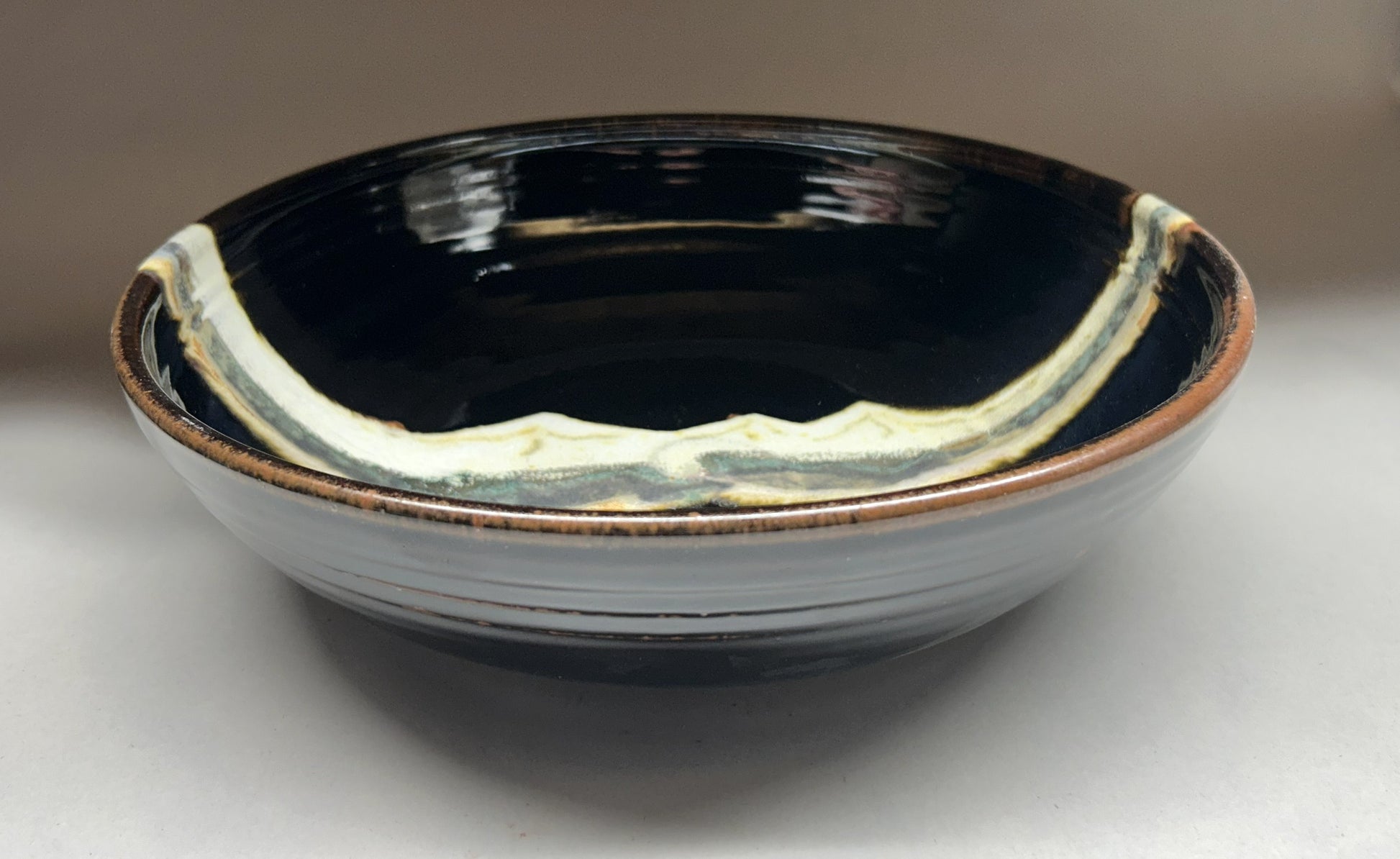 Keywords: handmade pottery serving bowl, Midnight Mountain Glaze, artisan pottery, ceramic bowl, unique handmade dinnerware, wheel-thrown pottery, rustic elegant serving bowl.