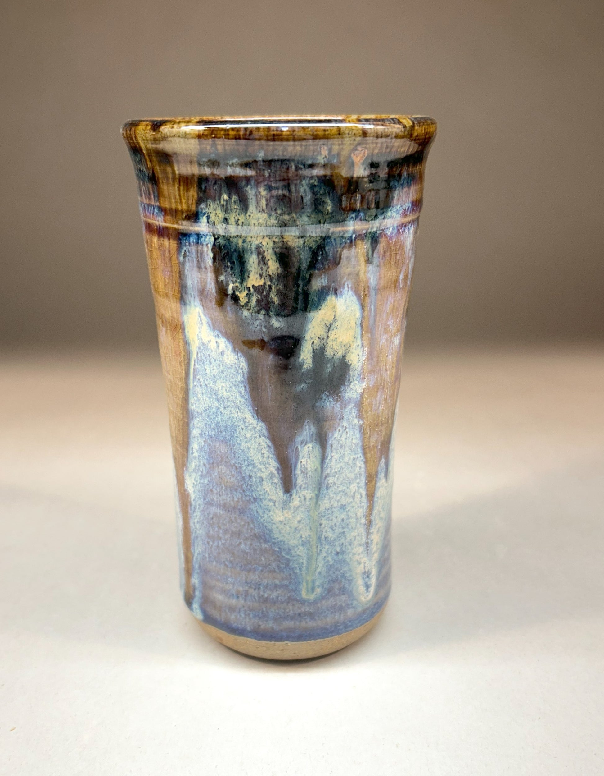 Discover the beauty of artisanal craftsmanship with this handmade pottery tumbler, featuring a captivating everything glaze. Each piece is a one-of-a-kind creation, showcasing an exquisite blend of colors like deep blues, earthy greens, warm ochres, and subtle metallic accents. The glossy ceramic finish enhances the vibrant hues and creates a smooth, polished texture that feels luxurious in your hand.
