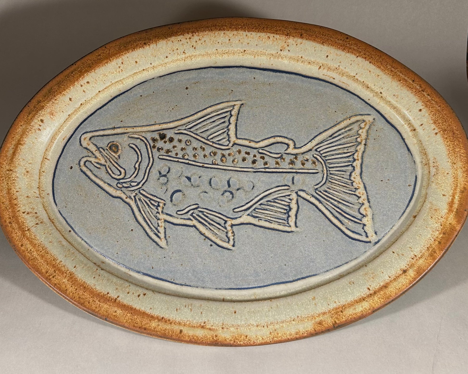 This handmade stoneware platter, featuring an intricately hand-carved salmon design, combines artistic craftsmanship with natural beauty. The detailed salmon motif, set against earthy tones, evokes the serene elegance of rivers and streams, making it a standout piece for any home. Perfect for serving or as a decorative centerpiece, this unique stoneware platter adds a touch of nature-inspired charm to your dining or living space. Ideal for collectors and those who appreciate functional art, this handcrafted platter is both a practical serving dish and a stunning work of art.